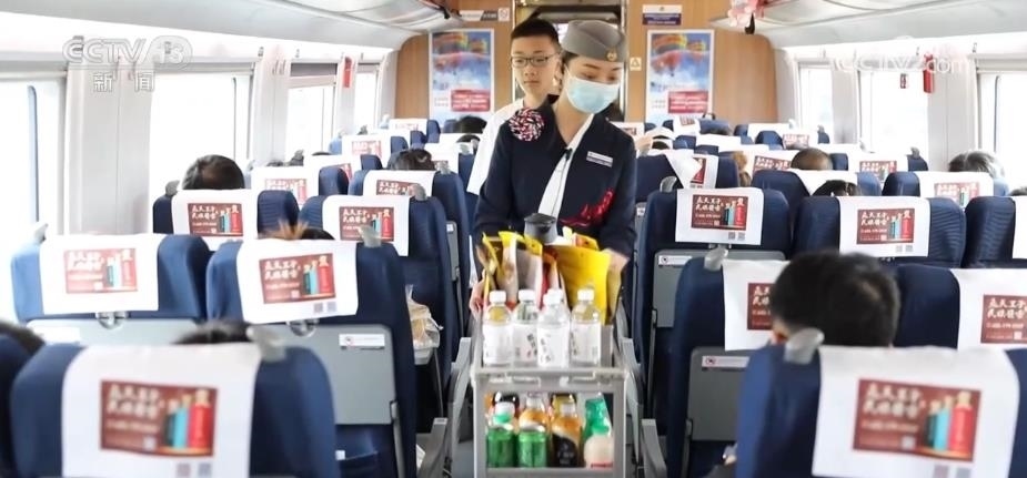 為了讓旅客在高鐵上有更多的美食選擇,高鐵移動餐車,每1小時前往各車廂送餐1次,旅客在選購的同時,也可以通過移動餐車進行訂餐服務(wù)。