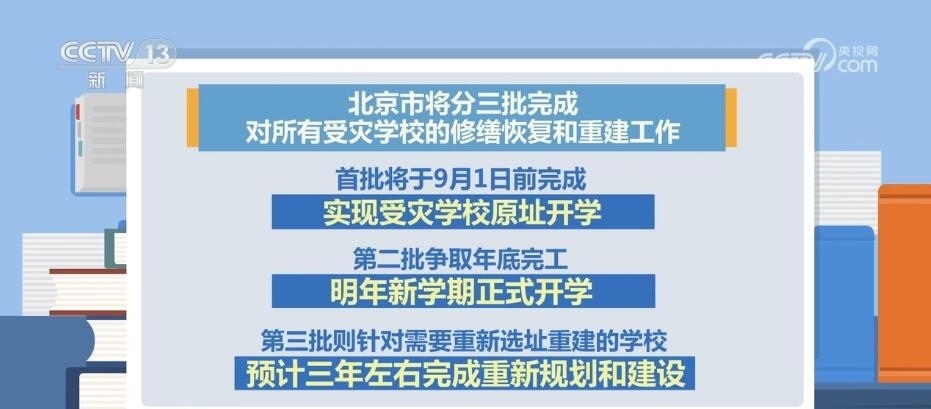 據(jù)了解,北京市將分三批完成對所有受災(zāi)學校的修繕恢復和重建工作。其中,首批將于9月1日前完成,實現(xiàn)受災(zāi)學校原址開學。第二批爭取年底完工,明年新學期正式開學。第三批則針對需要重新選址重建的學校,預(yù)計三年左右完成重新規(guī)劃和建設(shè)。