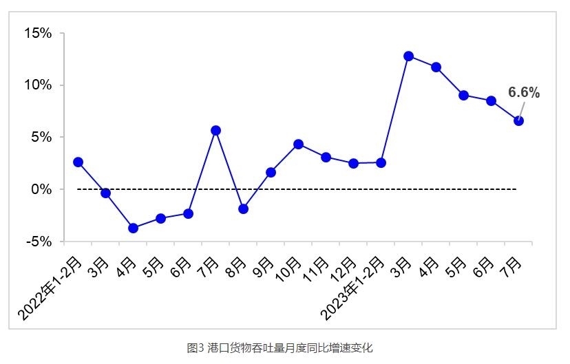 7月,全國港口完成貨物吞吐量14.3億噸,同比增長6.6%,其中內(nèi)、外貿(mào)吞吐量分別增長5.8%和8.5%。完成集裝箱吞吐量2705萬標(biāo)箱,同比增長2.6%。