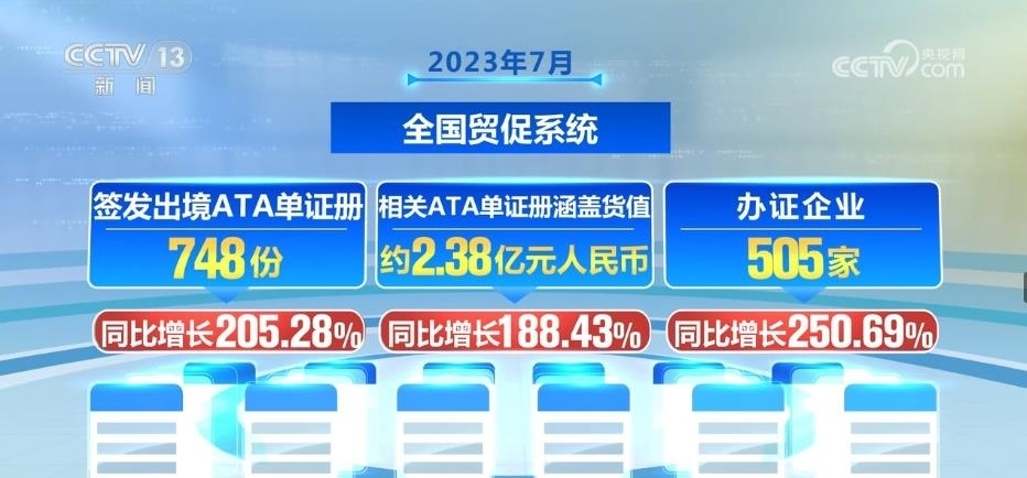 2023年7月,全國貿(mào)促系統(tǒng)共簽發(fā)出境ATA單證冊748份,同比增長205.28%;相關ATA單證冊涵蓋貨值約2.38億元人民幣,同比增長188.43%;辦證企業(yè)505家,同比增長250.69%。