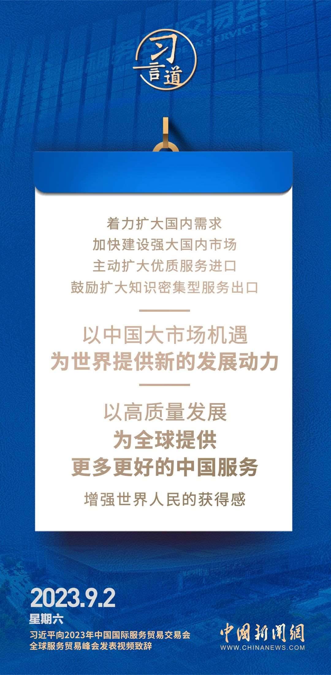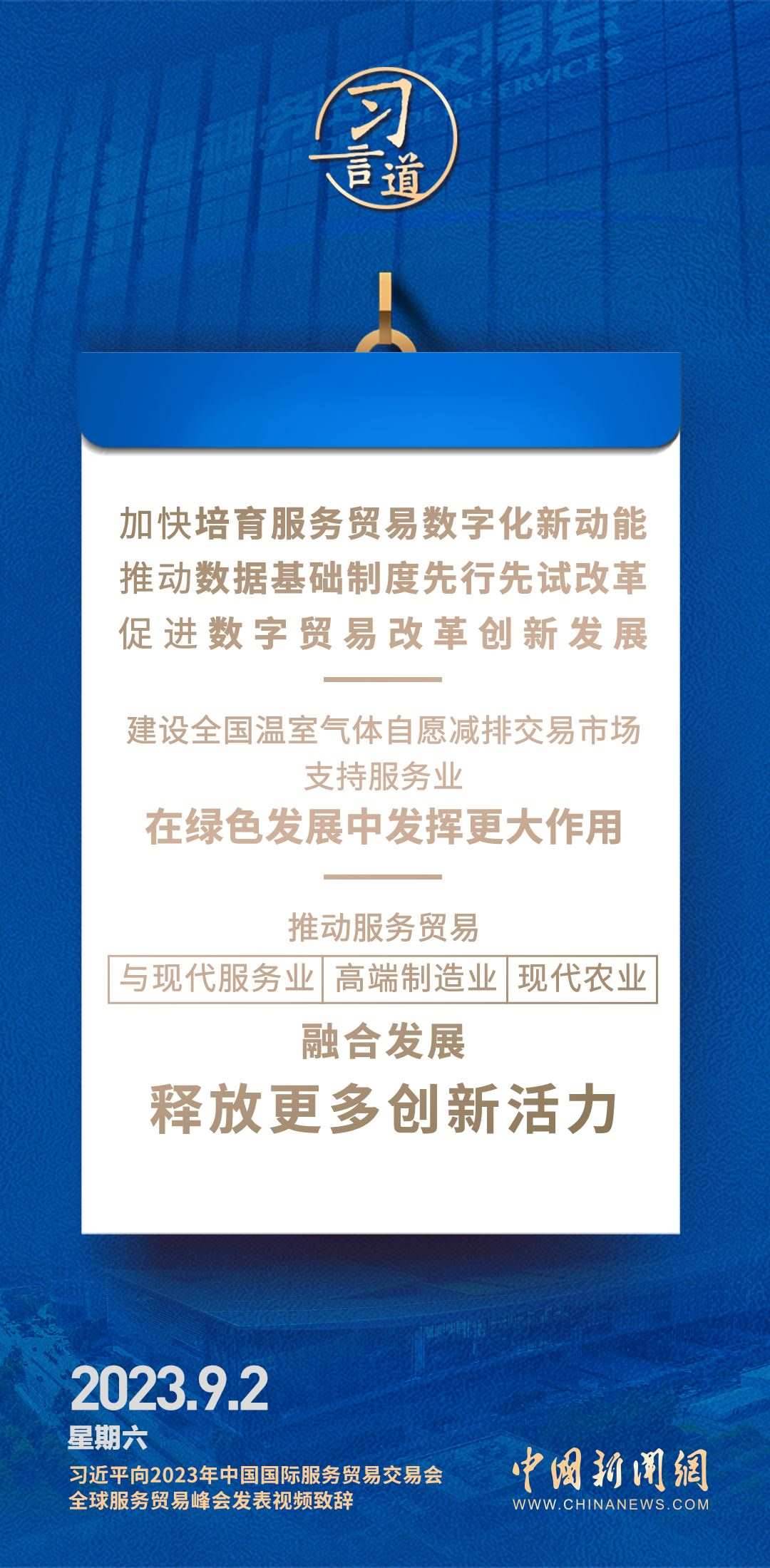 9月2日上午,國(guó)家主席習(xí)近平在北京向2023年中國(guó)國(guó)際服務(wù)貿(mào)易交易會(huì)全球服務(wù)貿(mào)易峰會(huì)發(fā)表視頻致辭。習(xí)近平指出——
