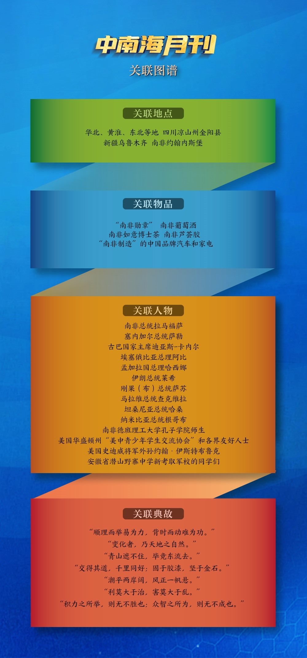 關(guān)聯(lián)物品“南非勛章”吸引了世界目光。8月22日,在南非比勒陀利亞總統(tǒng)府,拉馬福薩總統(tǒng)捧起一枚“南非勛章”,鄭重為習(xí)近平主席佩戴上。這是南非授予重要友好國家元首的最高級別勛章和最高榮譽,也成為兩國“同志加兄弟”特殊友好關(guān)系的有力見證。