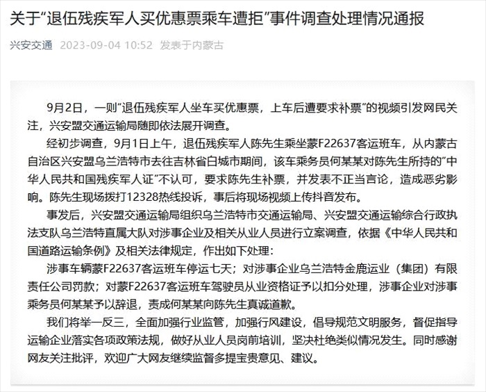 ·興安盟交通運(yùn)輸局通報“退伍殘疾軍人買優(yōu)惠票乘車遭拒”:涉事乘務(wù)員被辭退。