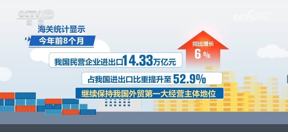 海關(guān)統(tǒng)計(jì)顯示,2023年前8個(gè)月,我國民營企業(yè)進(jìn)出口14.33萬億元,同比增長6%,占我國進(jìn)出口比重提升至52.9%,繼續(xù)保持我國外貿(mào)第一大經(jīng)營主體地位。