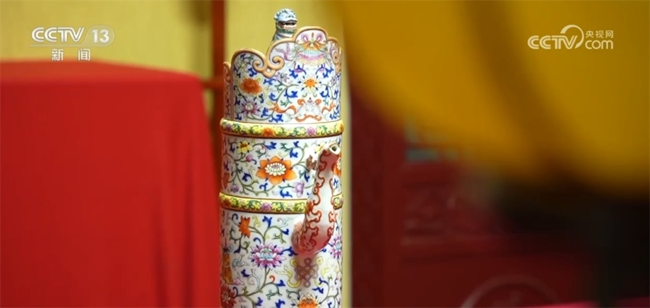 總臺記者 楊雪:沈陽故宮當中的很多珍貴院藏文物都見證了多民族文化融合的過程,像我們眼前看到的這款清乾隆款粉彩多穆壺就是其中之一。多穆在藏語當中是奶茶桶的意思,直到現在,像銅制、木制、皮質的很多多穆壺仍然被蒙、藏等少數民族沿襲使用著。大家可以看到,這款多穆壺的蓋子上蹲坐著一只非常靈動的小獅子,有祈福和護佑主人的意思。這件多穆壺是國家一級文物,距今已經有200多年的歷史了。