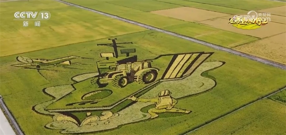 總臺央視記者 蔣樹林:金秋9月的稻田是什么顏色的?9月的稻香又是什么味道?來這里,有可能會找到您想要的答案。我現在是在黑龍江北大荒閆家崗農場。大家來看,這個稻田觀景臺有十多米高,因此站在這里,秋日稻田大片的圖案映入眼簾,今年稻田畫以“鄉(xiāng)村振興”“數字農業(yè)”為主題,生動展現了“讓農業(yè)更美好、讓農民更幸?!钡拿篮迷妇?。稻田畫是農民們勤勞與智慧的展現,他們用稻田畫為家鄉(xiāng)水稻代言,而對于在黑土地打拼的北大荒人而言,還有更重要的意義。
