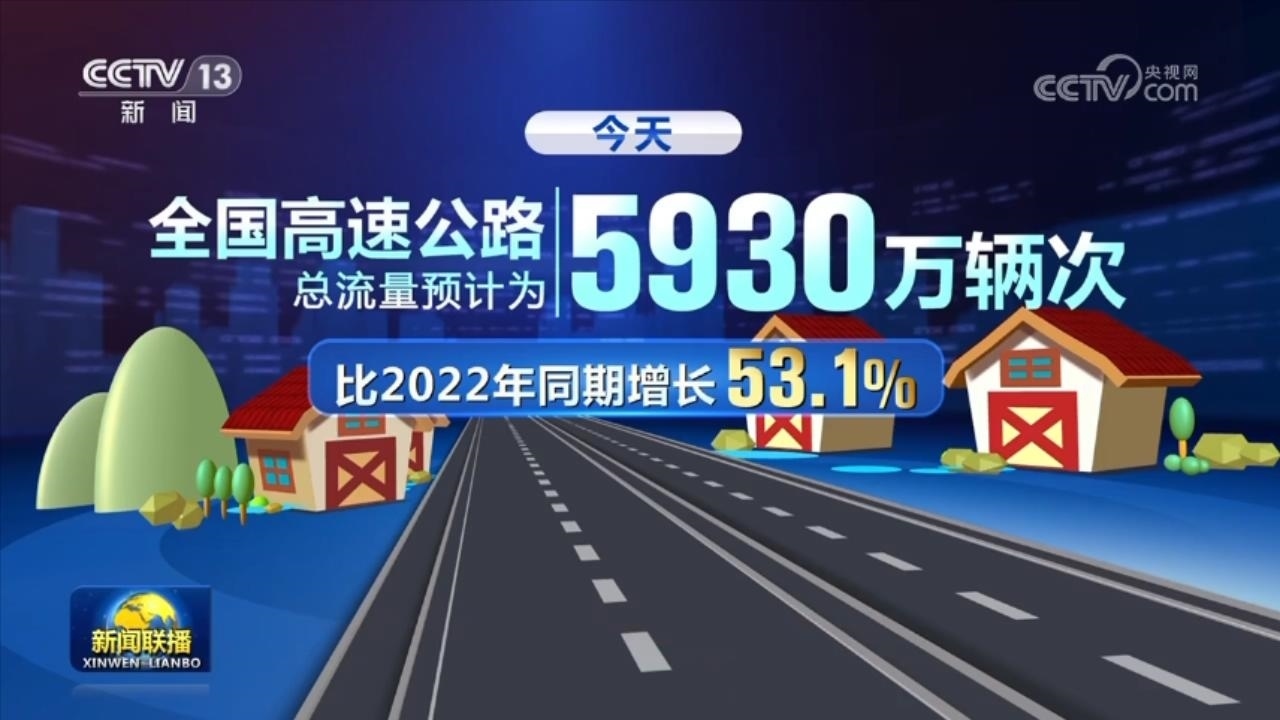 今天,全國高速公路總流量預(yù)計為5930萬輛次,比2022年同期增長53.1%。