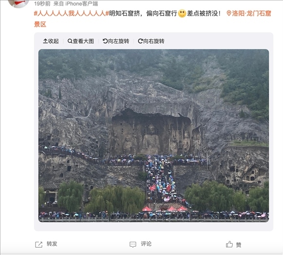 有定位在龍門石窟景區(qū)的網(wǎng)友發(fā)布圖片并配文稱:“明知石窟擠,偏向石窟行。差點(diǎn)被擠沒!”