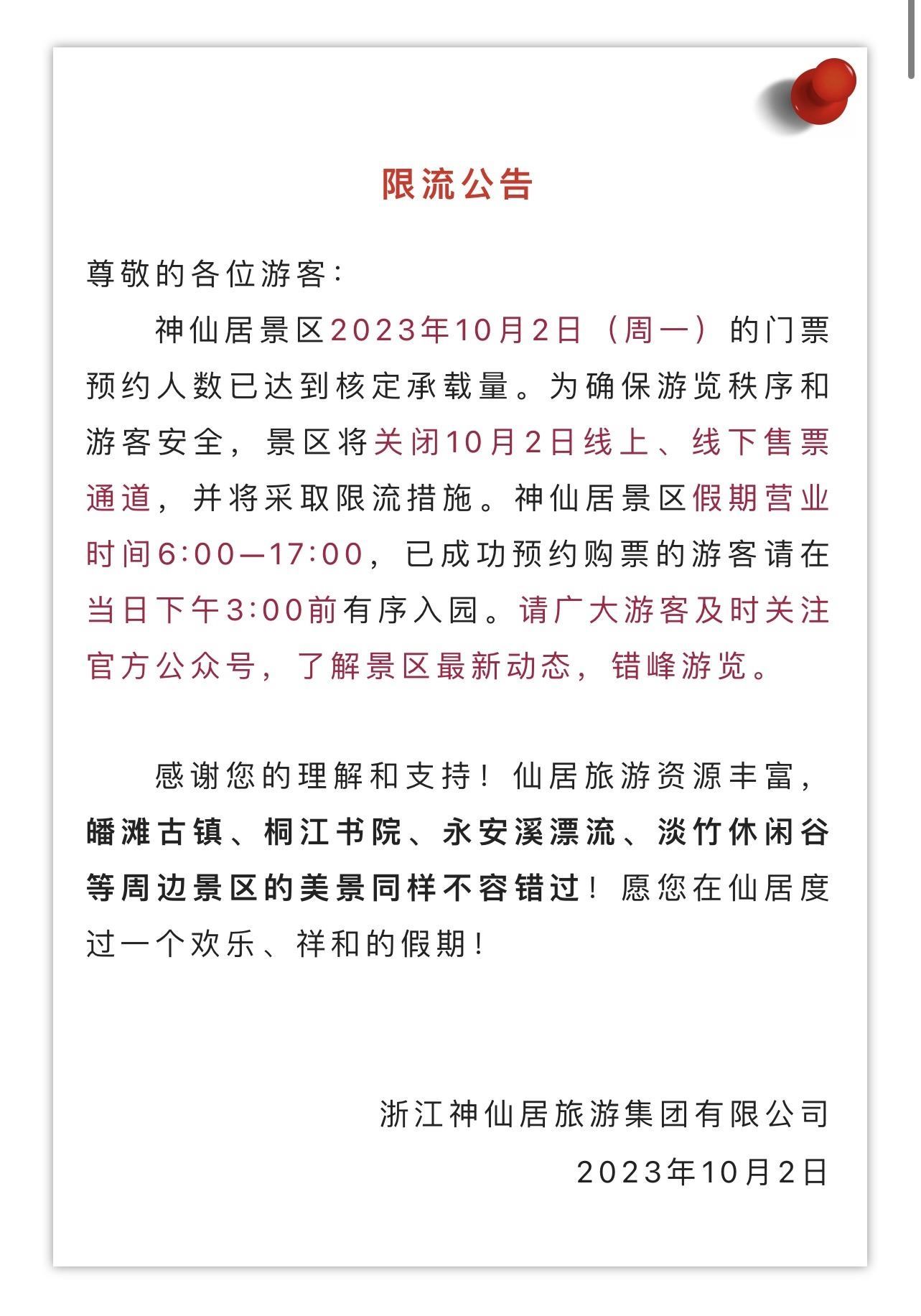 臺州神仙居景區(qū)于10月2日零點(diǎn)就發(fā)布當(dāng)日門票已約滿的消息。