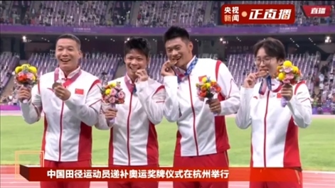 10月4日晚,杭州亞運(yùn)會(huì)田徑比賽結(jié)束后,中國奧委會(huì)在杭州奧體中心體育場(chǎng)舉行遞補(bǔ)奧運(yùn)獎(jiǎng)牌頒獎(jiǎng)儀式。