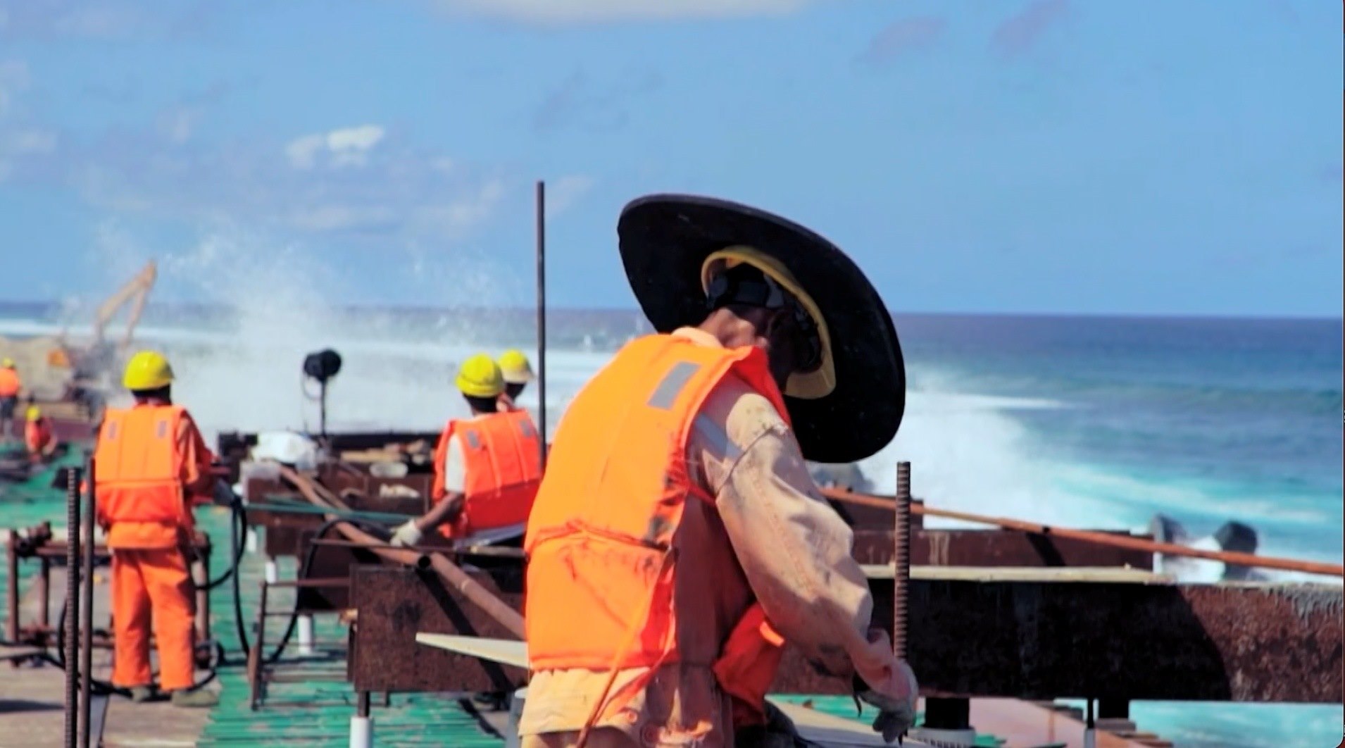 而此時,在兩公里外的嘎杜海峽上,中國建設者正與驚濤駭浪斗、 與高溫高濕斗、與復雜地質斗……