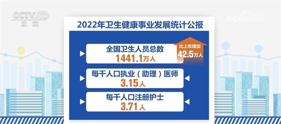 《公報(bào)》顯示,我國(guó)醫(yī)療衛(wèi)生資源總量繼續(xù)增加。到2022年末,全國(guó)醫(yī)療衛(wèi)生機(jī)構(gòu)達(dá)到1032918個(gè),比上年增加1983個(gè)。全國(guó)共設(shè)置13個(gè)類(lèi)別的國(guó)家醫(yī)學(xué)中心和兒童類(lèi)別的國(guó)家區(qū)域醫(yī)療中心。全國(guó)醫(yī)療衛(wèi)生機(jī)構(gòu)床位975.0萬(wàn)張,每千人口醫(yī)療衛(wèi)生機(jī)構(gòu)床位數(shù)由2021年的6.70張?jiān)黾拥?022年的6.92張。全國(guó)衛(wèi)生人員總數(shù)1441.1萬(wàn)人,比上年增加42.5萬(wàn)人。每千人口執(zhí)業(yè)(助理)醫(yī)師3.15人,每千人口注冊(cè)護(hù)士3.71人。