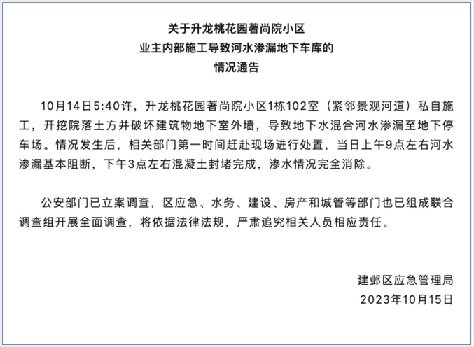 ·網(wǎng)傳南京一業(yè)主濫挖地下室致河水倒灌車庫(kù),官方通報(bào):多部門調(diào)查追責(zé)。