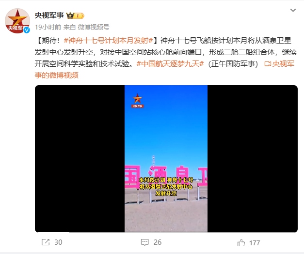 據(jù)“央視軍事”微博賬號報(bào)道 神舟十七號飛船按計(jì)劃本月(十月)將從酒泉衛(wèi)星發(fā)射中心發(fā)射升空,對接中國空間站核心艙前向端口,形成三艙三船組合體,繼續(xù)開展空間科學(xué)實(shí)驗(yàn)和技術(shù)試驗(yàn)。