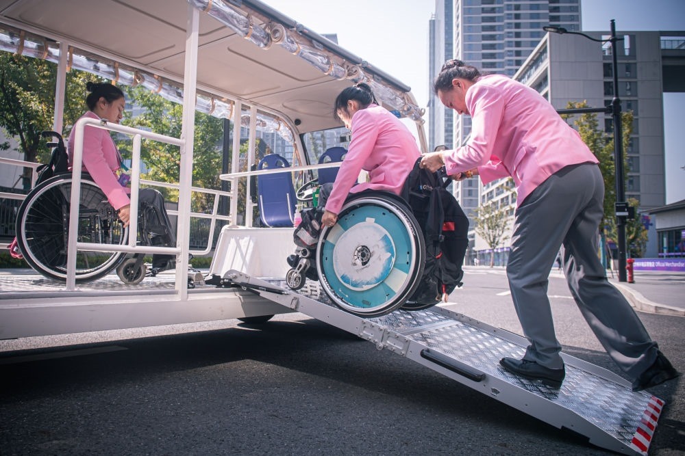 10月16日,中國(guó)體育代表團(tuán)成員在杭州亞殘運(yùn)村內(nèi)乘坐無障礙接駁車出行。新華社記者 江漢 攝
