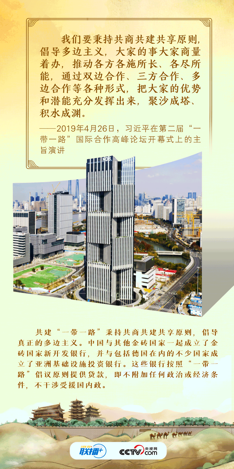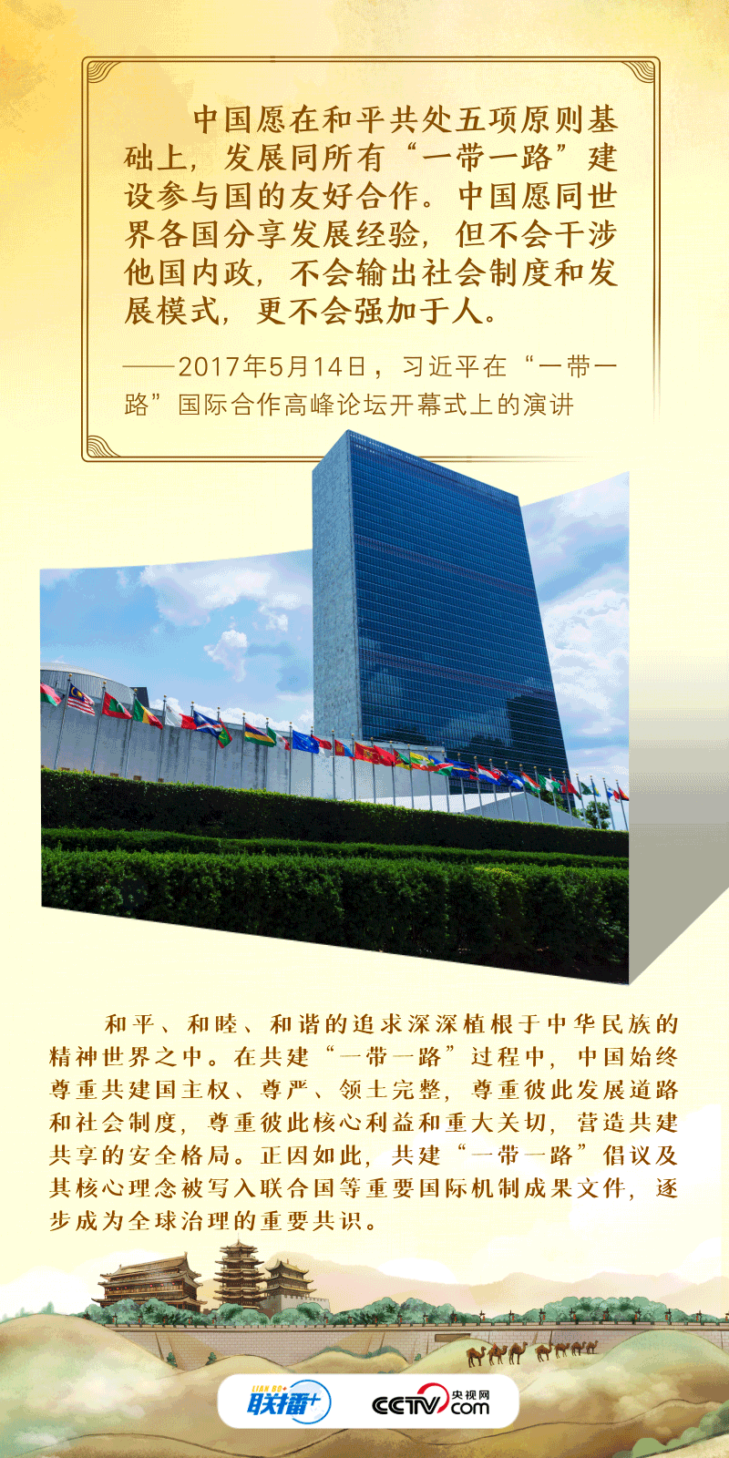 “古絲綢之路綿亙?nèi)f里、延續(xù)千年,積淀了以和平合作、開放包容、互學(xué)互鑒、互利共贏為核心的絲路精神?!?017年,習(xí)近平主席在首屆“一帶一路”國(guó)際合作高峰論壇開幕式上系統(tǒng)闡述了絲路精神的內(nèi)涵,倡議將“一帶一路”建成和平之路。