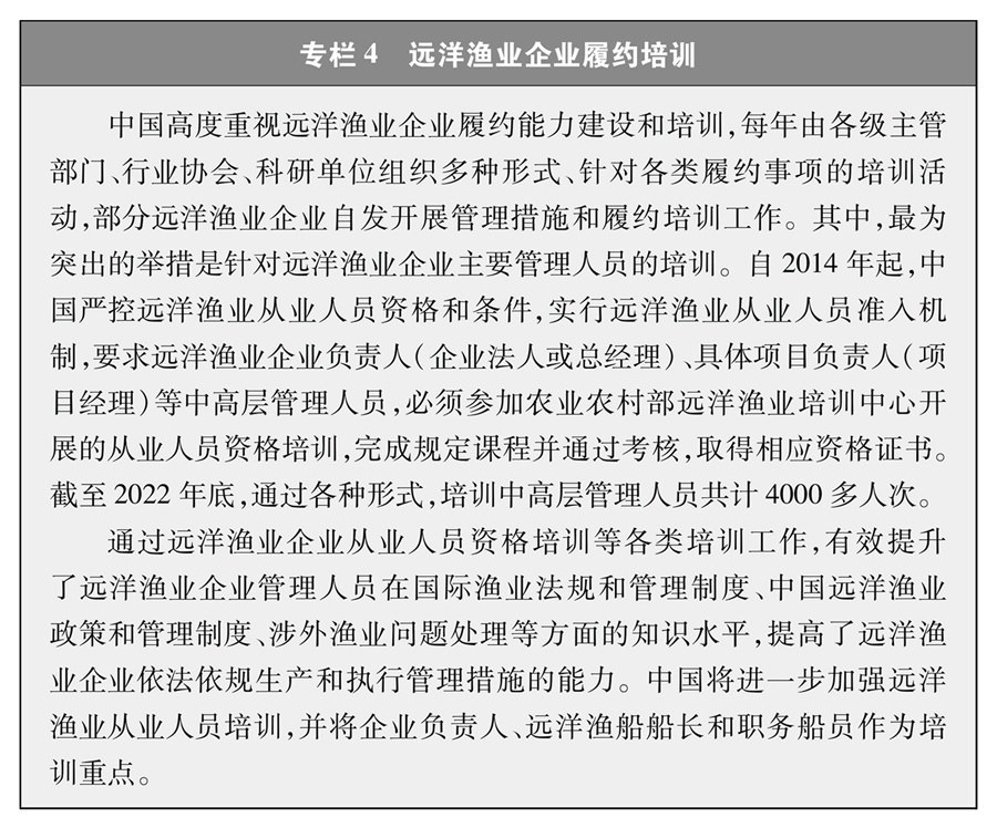 中國遠(yuǎn)洋漁業(yè)管理堅(jiān)持以科學(xué)為基礎(chǔ),建立并完善由主管部門、行業(yè)協(xié)會(huì)、科研單位通力合作的管理和履約科技支撐體系,共同制定漁業(yè)管理策略、實(shí)施管理措施并對(duì)實(shí)施效果進(jìn)行評(píng)價(jià)。充分發(fā)揮行業(yè)協(xié)會(huì)在組織協(xié)調(diào)漁業(yè)生產(chǎn)、規(guī)范企業(yè)行為、組織從業(yè)人員培訓(xùn)、加強(qiáng)行業(yè)自律、推廣示范應(yīng)用等方面的作用,成立遠(yuǎn)洋漁業(yè)履約研究中心、遠(yuǎn)洋漁業(yè)數(shù)據(jù)中心,完善履約工作機(jī)制,加強(qiáng)相關(guān)科研機(jī)構(gòu)和智庫建設(shè),逐步提高履約能力和成效。