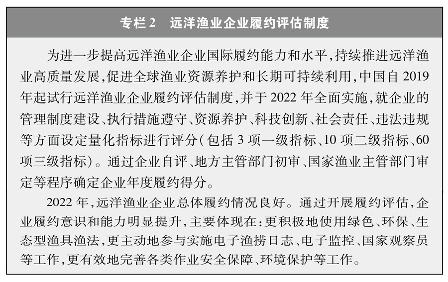 遠(yuǎn)洋漁業(yè)企業(yè)和漁船是履行國際公約、合法合規(guī)從事漁業(yè)生產(chǎn)的主體。2022年中國正式實(shí)施遠(yuǎn)洋漁業(yè)企業(yè)履約評(píng)估制度,將企業(yè)履約成績與行政審批、政策支持等掛鉤,通過正向激勵(lì)、反向倒逼的方式,引導(dǎo)企業(yè)不斷完善管理制度,嚴(yán)格執(zhí)行管理措施,避免發(fā)生違規(guī)行為,切實(shí)提高履約能力。這一制度有力促進(jìn)了遠(yuǎn)洋漁業(yè)企業(yè)規(guī)范管理和國際履約,得到了各方關(guān)注和廣泛認(rèn)可。