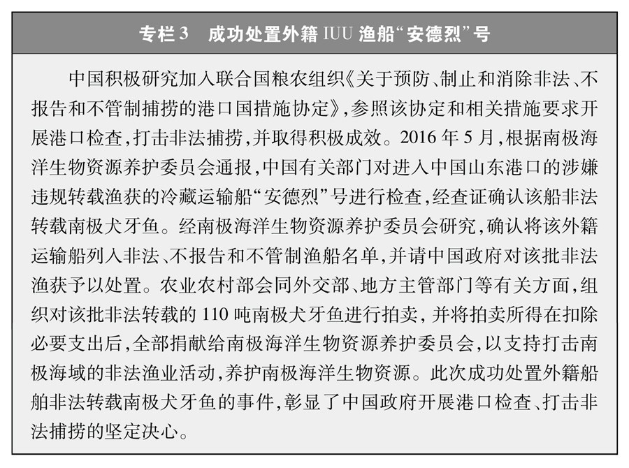 堅(jiān)決支持并積極配合國際社會(huì)打擊各種非法漁業(yè)活動(dòng)。2020年起,中國每年派遣執(zhí)法船赴北太平洋公海開展?jié)O業(yè)執(zhí)法巡航,查處違規(guī)作業(yè)行為。2016年,配合南極海洋生物資源養(yǎng)護(hù)委員會(huì)成功扣押處置了一艘外籍漁船非法轉(zhuǎn)載南極犬牙魚案件。2018年起,將中國加入的相關(guān)區(qū)域漁業(yè)管理組織公布的非法、不報(bào)告和不管制漁船名單通報(bào)國內(nèi)各港口,拒絕此類漁船進(jìn)港以及卸貨、補(bǔ)給、加油等活動(dòng)。