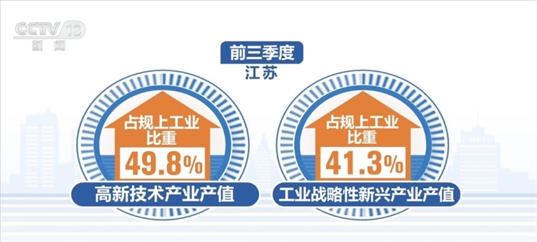 江蘇省今年以來不斷壯大先進(jìn)制造業(yè)規(guī)模,前三季度,江蘇省高新技術(shù)產(chǎn)業(yè)、工業(yè)戰(zhàn)略性新興產(chǎn)業(yè)產(chǎn)值占規(guī)上工業(yè)比重分別為49.8%、41.3%,比上半年均有提升。前三季度,新能源汽車、充電樁產(chǎn)量分別增長(zhǎng)80.2%和1.1倍。