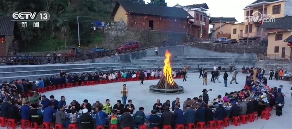 這天是十八洞村一個重要的日子,村里人聚在一起點起了篝火,擺起了長龍宴,見證苗家文化廣場投入使用。