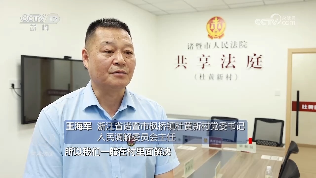 浙江省諸暨市楓橋鎮(zhèn)杜黃新村黨委書記、人民調解委員會主任王海軍:“村里一般的調解村兩委會以及村調委基本上就地解決,因為‘楓橋經驗’矛盾不出村,所以我們一般在村里面解決。但是涉及到法律法規(guī)一塊或者有些老百姓在‘心結’上面解不開,我們就動用共享法庭?!?/p>