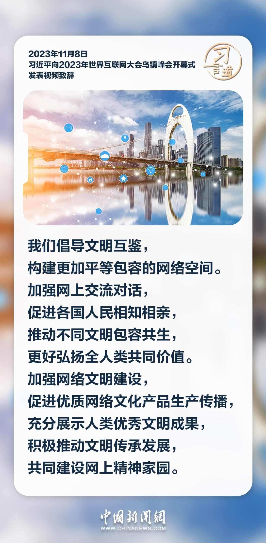 11月8日上午,國(guó)家主席習(xí)近平向2023年世界互聯(lián)網(wǎng)大會(huì)烏鎮(zhèn)峰會(huì)開幕式發(fā)表視頻致辭。習(xí)近平指出——
