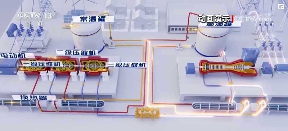 在江蘇常州的金壇鹽穴壓縮空氣國(guó)家試驗(yàn)示范電站,這個(gè)電站可以把電能儲(chǔ)存在廢棄的地下鹽穴里。它在夜間用電負(fù)荷低的時(shí)候,用電帶動(dòng)空氣壓縮機(jī)充電,過(guò)程好比給鹽穴這個(gè)“氣球”打氣,將1個(gè)標(biāo)準(zhǔn)大氣壓的空氣壓縮為140個(gè)標(biāo)準(zhǔn)大氣壓的高壓空氣。白天需要時(shí),一鍵啟動(dòng)釋放壓縮空氣,產(chǎn)生巨大的動(dòng)能帶動(dòng)發(fā)電機(jī)發(fā)電。