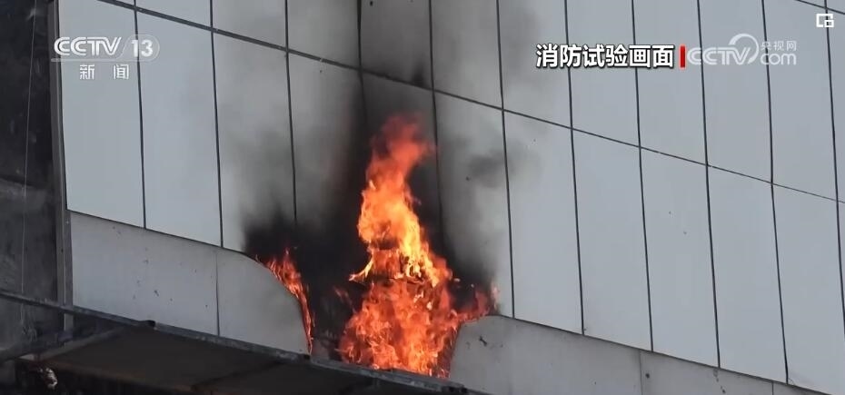 為了真實(shí)模擬高層保溫層火災(zāi)特性,消防滅火無(wú)人機(jī)噴射一分鐘高壓液體后就停止作業(yè)。此時(shí),過(guò)火鋁塑板周邊縫隙還不斷有黑煙冒出,大約2分鐘后,這些鋁塑板的縫隙里開始出現(xiàn)明火,這就意味著鋁塑板下層的保溫層泡沫出現(xiàn)了復(fù)燃,與此同時(shí),滴落在下方平臺(tái)上的泡沫殘?jiān)查_始復(fù)燃。5分鐘后,表層的鋁塑板被燒開,露出保溫層的熊熊火焰,同時(shí)與底部復(fù)燃的火焰上下貫通,外墻裝飾材料開始更為猛烈的燃燒,大量的裝飾材料被點(diǎn)燃,直接砸向地面或者四處飄落,火災(zāi)有進(jìn)一步擴(kuò)大的風(fēng)險(xiǎn)。
