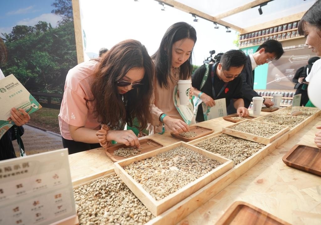 9月19日,在星巴克中國(guó)咖啡創(chuàng)新產(chǎn)業(yè)園開園儀式現(xiàn)場(chǎng),來賓在體驗(yàn)挑揀咖啡生豆。當(dāng)日,星巴克中國(guó)咖啡創(chuàng)新產(chǎn)業(yè)園在江蘇昆山落成投產(chǎn)。