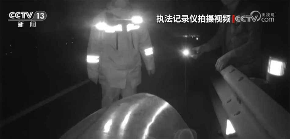 再來看前些天發(fā)生在京臺高速山東德州段的這一幕。晚上八點多,德州高速交警在轄區(qū)巡查時,發(fā)現(xiàn)在京臺高速往濟南方向的這一處內(nèi)側(cè)行車道上,掉落了一個大型管道,前方不遠處有一輛大型貨車正停在應(yīng)急車道內(nèi),而貨車駕駛?cè)苏驹谥醒胱o欄內(nèi),用手電筒提醒過往車輛。由于晚上途經(jīng)的大都是大型車輛,夜間視距較差,情況十分危險,現(xiàn)場交警分工配合,通過多次嘗試終于跑到了遺落物的旁邊進行處置。