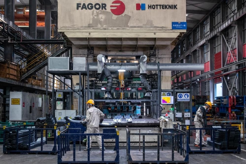 在位于重慶市兩江新區(qū)的一家機械設(shè)備生產(chǎn)企業(yè)的熱壓車間,工人將剛下線的零件裝箱(2023年7月16日攝)。新華社記者儲加音攝