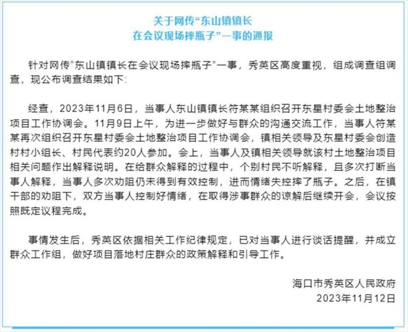 ·??谛阌^(qū)通報“東山鎮(zhèn)鎮(zhèn)長在會議現(xiàn)場摔瓶子”:已對當(dāng)事人進(jìn)行談話提醒。