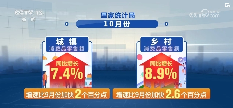 國家統(tǒng)計局最新數(shù)據(jù)顯示,在縣鄉(xiāng)消費市場基礎(chǔ)設(shè)施不斷完善、有效供給持續(xù)擴大等有利條件帶動下,鄉(xiāng)村市場銷售增速快于城鎮(zhèn)。10月份,城鎮(zhèn)、鄉(xiāng)村消費品零售額同比分別增長7.4%和8.9%,增速比9月份分別加快2和2.6個百分點。
