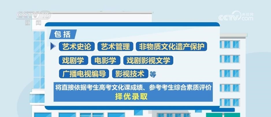 據(jù)了解,藝術(shù)類(lèi)專(zhuān)業(yè)依據(jù)考生高考文化成績(jī)、專(zhuān)業(yè)考試成績(jī),參考綜合素質(zhì)評(píng)價(jià)進(jìn)行招生錄取。此次藝考改革一個(gè)重要的變化是,部分藝術(shù)類(lèi)專(zhuān)業(yè)不再組織專(zhuān)業(yè)考試,包括藝術(shù)史論、藝術(shù)管理、非物質(zhì)文化遺產(chǎn)保護(hù)、戲劇學(xué)、電影學(xué)、戲劇影視文學(xué)、廣播電視編導(dǎo)、影視技術(shù)等,將直接依據(jù)考生高考文化課成績(jī)、參考考生綜合素質(zhì)評(píng)價(jià),擇優(yōu)錄取。