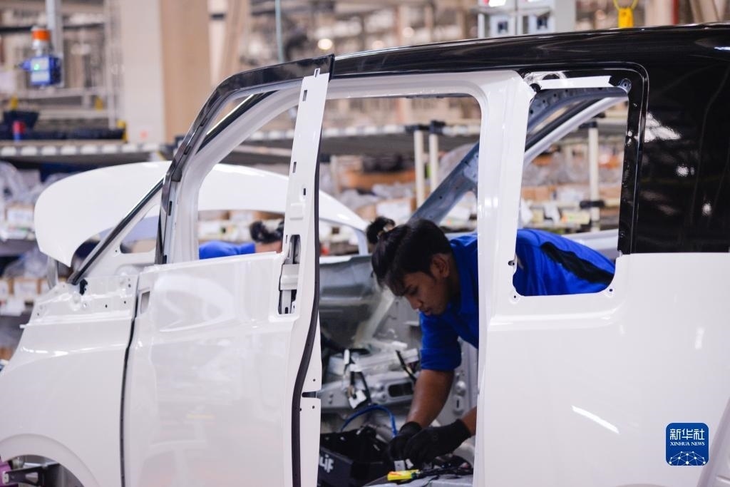 2月24日,在印度尼西亞勿加泗,工人在上汽通用五菱印尼汽車(chē)有限公司工廠(chǎng)的生產(chǎn)線(xiàn)上作業(yè)。新華社記者 徐欽 攝