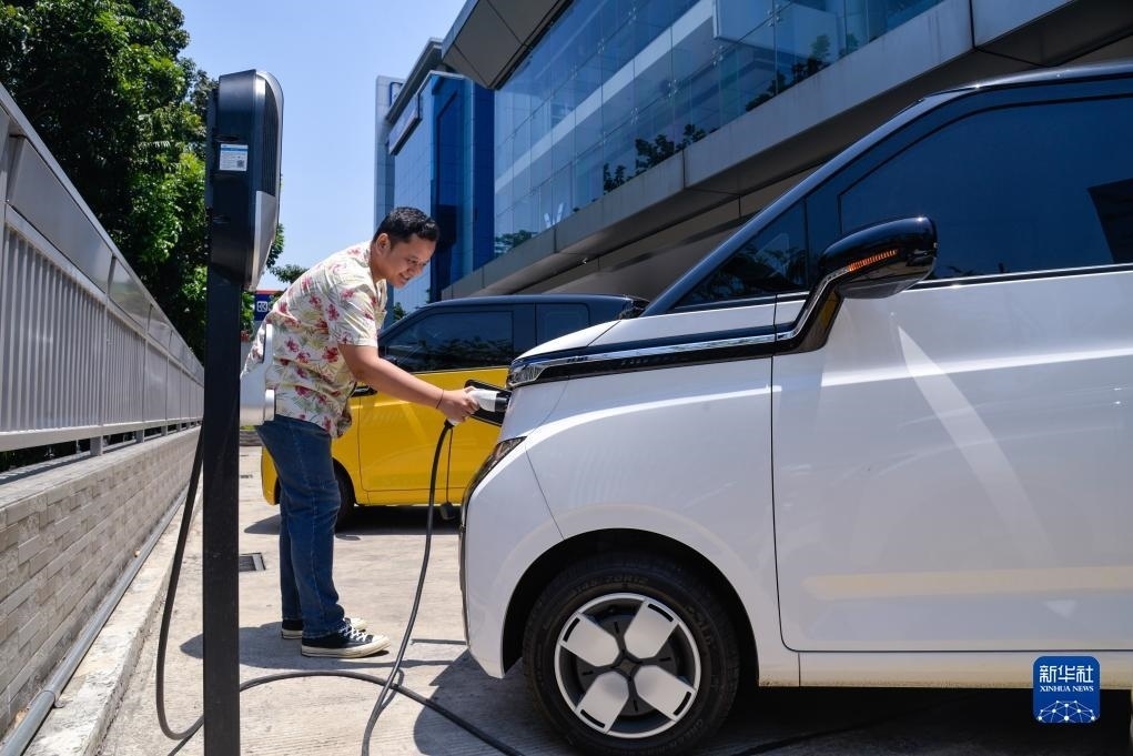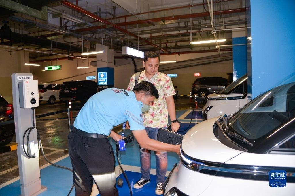 9月29日,在印度尼西亞雅加達(dá)一家商場(chǎng)的地下停車(chē)場(chǎng),工作人員為一位五菱新能源車(chē)Air ev車(chē)主結(jié)束充電。新華社記者 徐欽 攝