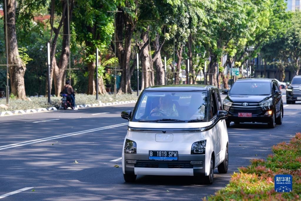 9月29日,在印度尼西亞雅加達(dá)街頭,一位車(chē)主駕駛著自己的五菱新能源車(chē)Air ev。新華社記者 徐欽 攝