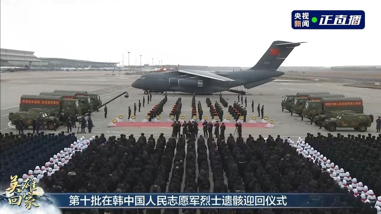 北京時間上午9時,中韓雙方在韓國仁川國際機場舉行志愿軍烈士遺骸交接儀式。上午11時32分,空軍專機運-20緩緩降落在遼寧沈陽桃仙國際機場。專機進入中國領(lǐng)空后,空軍兩架殲-20戰(zhàn)斗機護航,并在沈陽機場上空拉煙通場,“雙20同框”向志愿軍烈士致以崇高敬意,沈陽桃仙機場以“過水門”航空最高禮儀迎接志愿軍烈士回家。