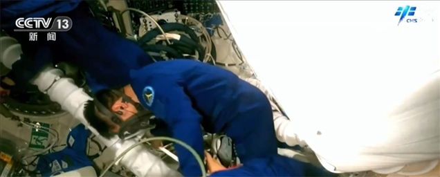 這是三位航天員密切協(xié)同運輸氧氣瓶組件的工作場景,動作麻利、默契十足。通過問天艙的機位,我們看到航天員湯洪波正在對低溫存儲柜進行清潔和相關設置工作,這套低溫存儲裝置可以滿足生物、試劑、材料等樣品不同低溫存儲條件,為開展長期空間實驗提供保障。