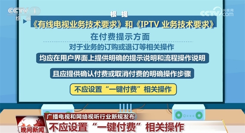 在付費(fèi)提示方面,對(duì)于業(yè)務(wù)的訂購(gòu)或退訂等相關(guān)操作,均應(yīng)在用戶界面上提供明確的提示說明和流程操作說明,且應(yīng)提供確認(rèn)付費(fèi)或取消付費(fèi)的明確操作步驟,不應(yīng)設(shè)置“一鍵付費(fèi)”相關(guān)操作。此外,有線電視和IPTV遙控器應(yīng)具備快捷看直播頻道的按鍵,通過此按鍵直接進(jìn)入全屏直播,按鍵名稱應(yīng)為“看電視”。