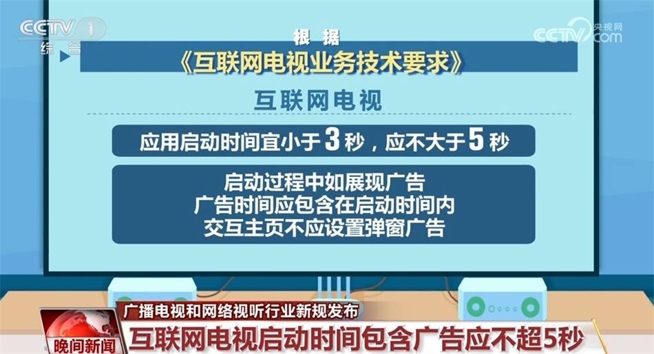 根據(jù)《互聯(lián)網(wǎng)電視業(yè)務(wù)技術(shù)要求》,互聯(lián)網(wǎng)電視應(yīng)用啟動(dòng)時(shí)間宜小于3秒,應(yīng)不大于5秒,啟動(dòng)過程中如展現(xiàn)廣告,廣告時(shí)間應(yīng)包含在啟動(dòng)時(shí)間內(nèi)。交互主頁(yè)不應(yīng)設(shè)置彈窗廣告。交互主頁(yè)應(yīng)設(shè)置顯著、便捷的免費(fèi)業(yè)務(wù)專區(qū)入口。在付費(fèi)提示方面,互聯(lián)網(wǎng)電視對(duì)于業(yè)務(wù)的訂購(gòu)或退訂等相關(guān)操作不應(yīng)設(shè)置“一鍵付費(fèi)”,對(duì)于任何業(yè)務(wù)的定期或連續(xù)扣費(fèi),均應(yīng)在扣費(fèi)前明確、主動(dòng)提示用戶。