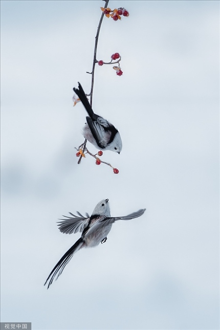 黑龍江大慶,城市森林公園,北長(zhǎng)尾山雀在雪中嬉戲、打斗、覓食。