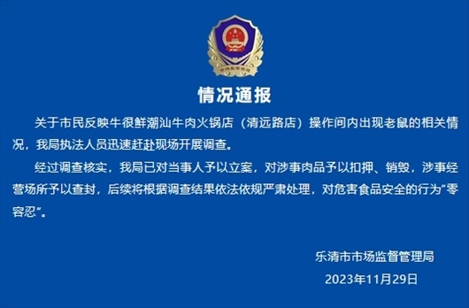 ·溫州樂清官方通報(bào)火鍋店現(xiàn)老鼠啃牛排:已對(duì)當(dāng)事人予以立案,對(duì)涉事肉品予以扣押、銷毀,涉事經(jīng)營(yíng)場(chǎng)所予以查封。