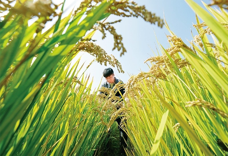 近年來,河北省唐山市通過鹽堿地土壤科學改良、耐堿作物品種培育、適用耕作技術(shù)研究應(yīng)用等系列治理措施,在鹽堿地上開發(fā)建設(shè)了高標準農(nóng)田88.6萬畝,有效提高鹽堿地利用水平。圖為2023年10月11日,農(nóng)業(yè)科研人員在唐山市曹妃甸區(qū)第五農(nóng)場鹽堿地改良而成的高標準稻田內(nèi)工作。 新華社記者 楊世堯/攝