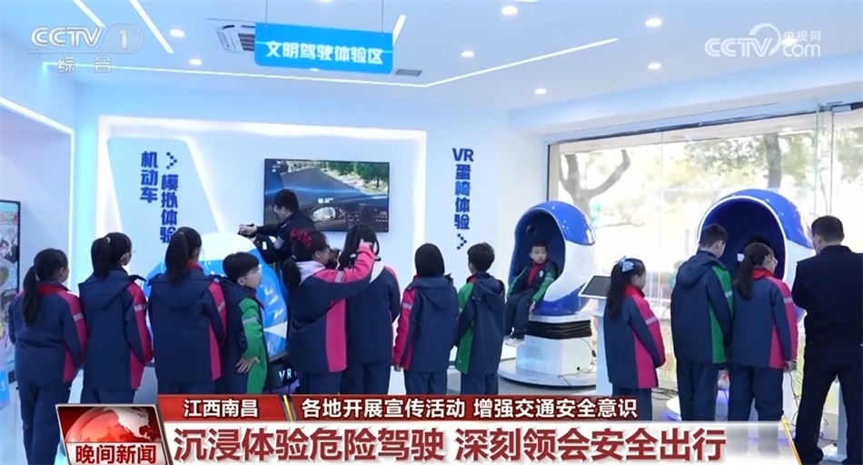 在江西南昌公安交通治理體驗中心,來自南昌市郵政路小學(xué)的同學(xué)們在民警的帶領(lǐng)下,開展了一堂別開生面的交通安全課。大家戴上VR設(shè)備,通過機(jī)動車模擬駕駛、交通事故模擬裝置等,沉浸式體驗了酒駕醉駕、超速等交通違法行為的場景。晃動的座椅給同學(xué)們帶來了事故撞擊的震感,旋轉(zhuǎn)的設(shè)備更是讓同學(xué)們身臨其境地感受到酒后駕駛的眩暈。