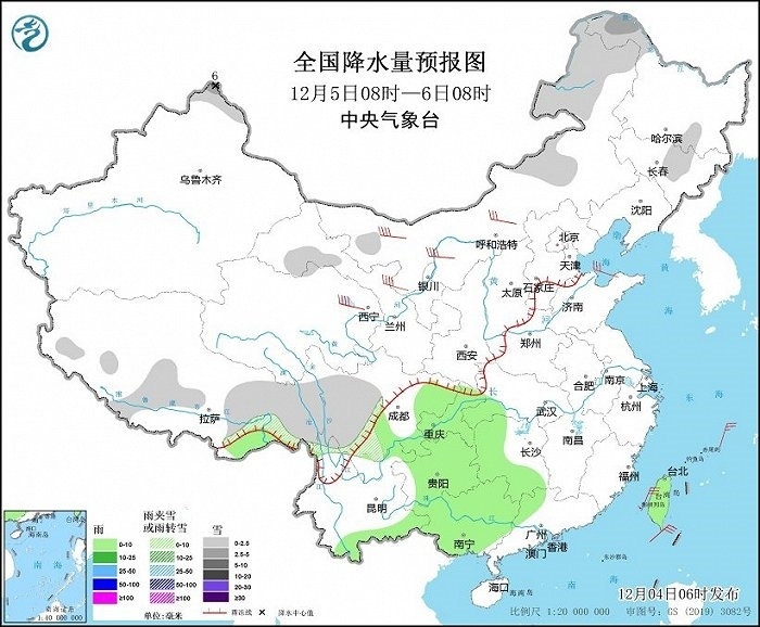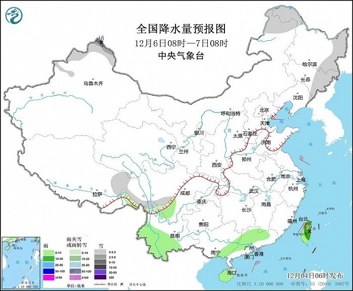 12月4日08時(shí)至5日08時(shí),新疆北部、甘肅河西、青海南部、西藏中東部和南部、川西高原北部等地部分地區(qū)有小到中雪或雨夾雪,其中,新疆阿勒泰山區(qū)和伊犁河谷、西藏南部等地部分地區(qū)有大到暴雪,局地大暴雪(20~22毫米)。湖南南部、江西南部、浙江大部、福建、廣東東部和北部、廣西西部、云南南部、海南島、臺(tái)灣島等地部分地區(qū)有小到中雨,其中,臺(tái)灣島中南部等地部分地區(qū)有大雨(25~40毫米)。新疆北疆北部、內(nèi)蒙古大部、甘肅河西等地部分地區(qū)有4~6級風(fēng)(見圖1)。