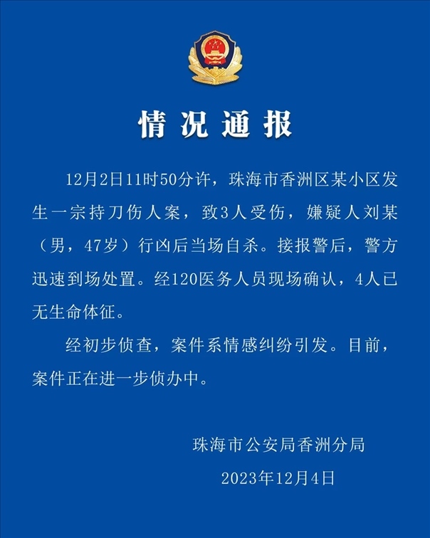 ·警方通報(bào)珠海一小區(qū)發(fā)生命案4人死亡:系情感糾紛引發(fā),男子致3死后自殺身亡。