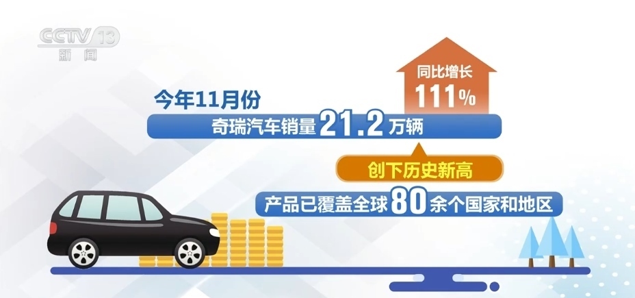 最新數(shù)據(jù)顯示,2023年11月份,奇瑞汽車銷量21.2萬輛,同比增長111%,創(chuàng)下歷史新高,產(chǎn)品已覆蓋全球80余個國家和地區(qū)。