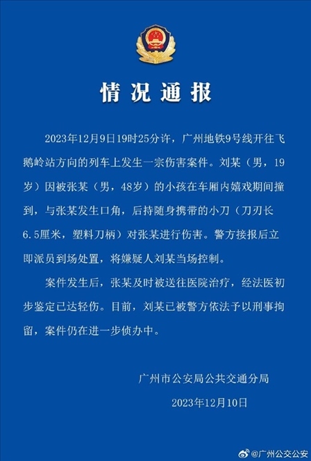·警方通報“廣州地鐵9號線持刀傷人事件”,廣州地鐵回應:涉案刀具不在管制范圍內。